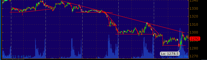 Good afternoon ladies, one this different about today.. The babe is different.. anyway you can see from the headline there is not any new prices to talk abou today besides the very short lived low in the ES of 1278.5 this past evening as word got out the debt vote was delayed. 1290 being support intra day a level which was sticky in the overnight session as well. you can bet stops reside below with level and any trades over 1300 will surely trigger a buy program....