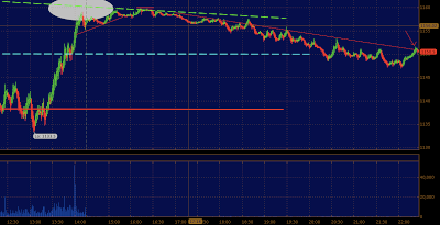 5 min ES The channel was broken to the downside @ 1257.75 which lead to a trade down to 1245. Not a huge move but the market has been up...
