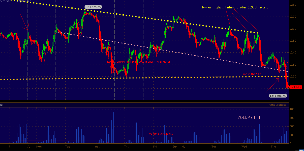As i mentioned in my video's i like the S&P long OVER the 1260 metric because if we DID trade over the yellow line it would take some serious buying. That buying never showed up and the volume was all on the downside once again.. Participants wait, then pounce. 1228 was the low so far this evening as the dollar pushed up near the 79 level.