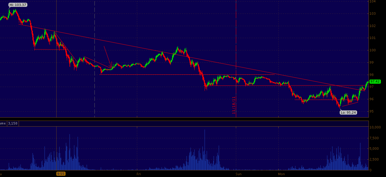 98.5 was a big support level in CL which showed quite a bit of volume when it broke.. now is minor resistance .. along with 1194 ES.