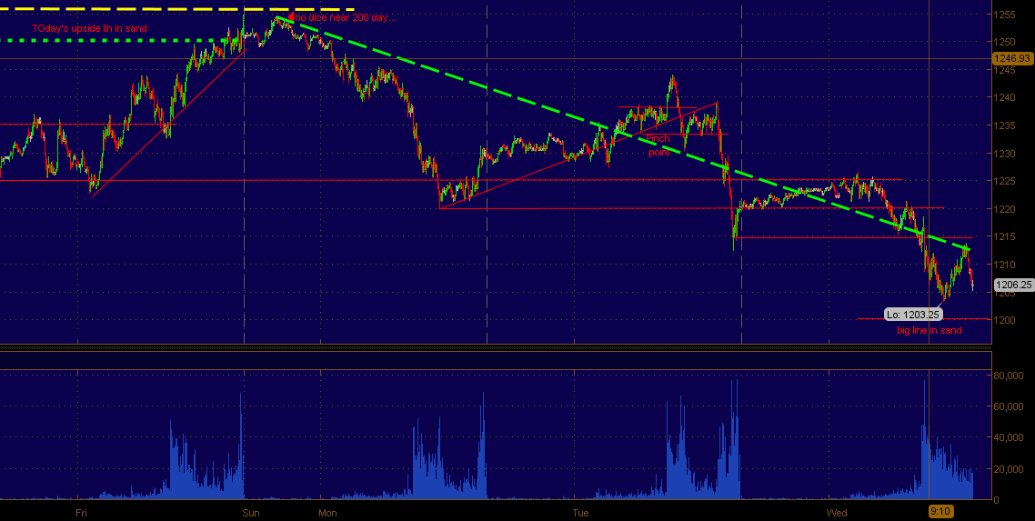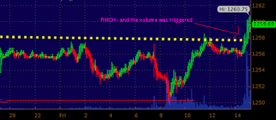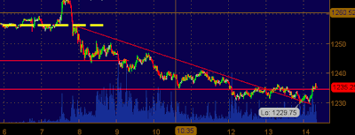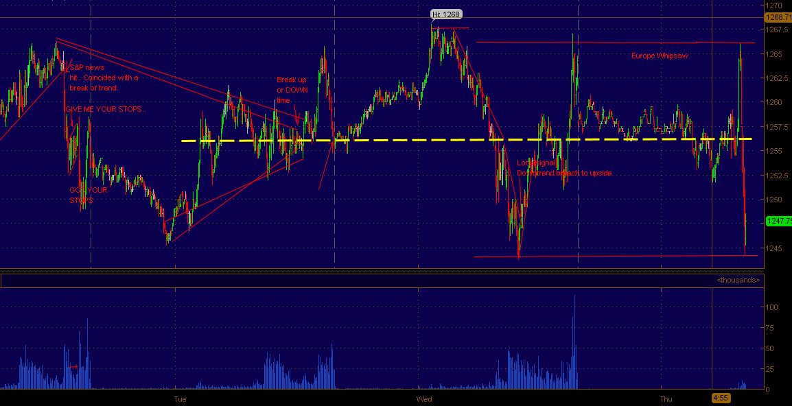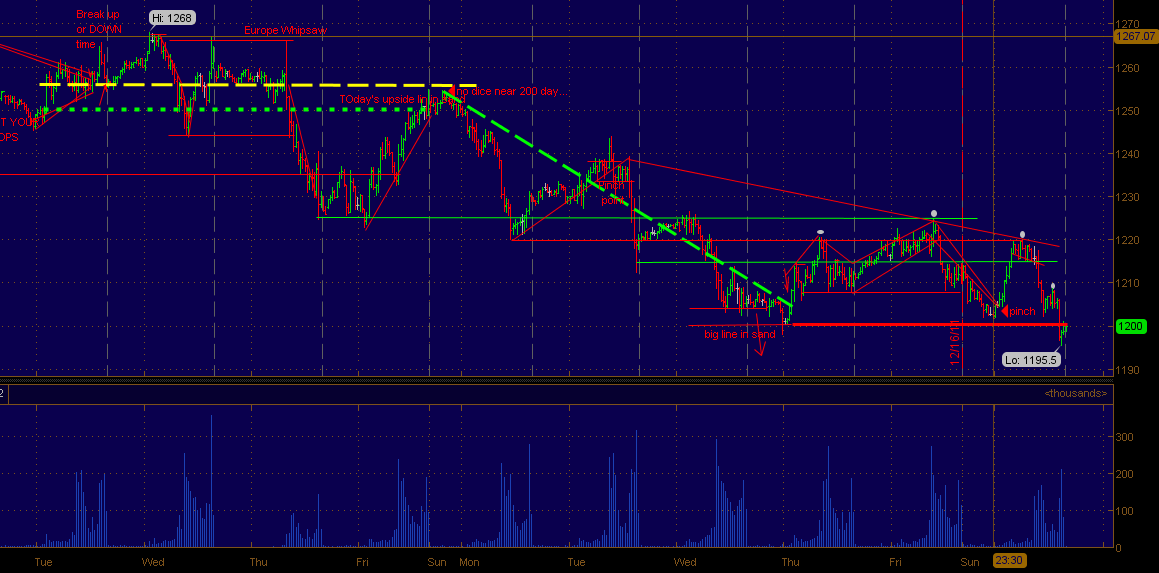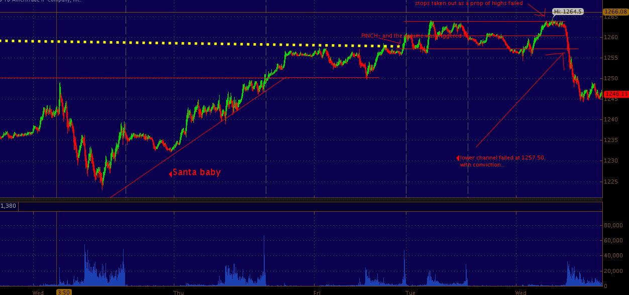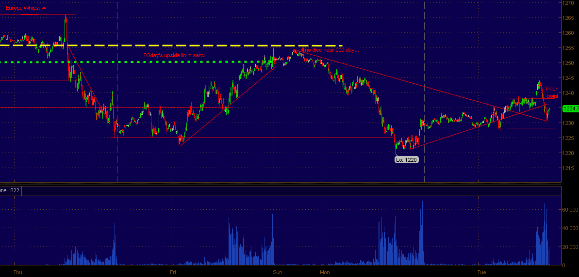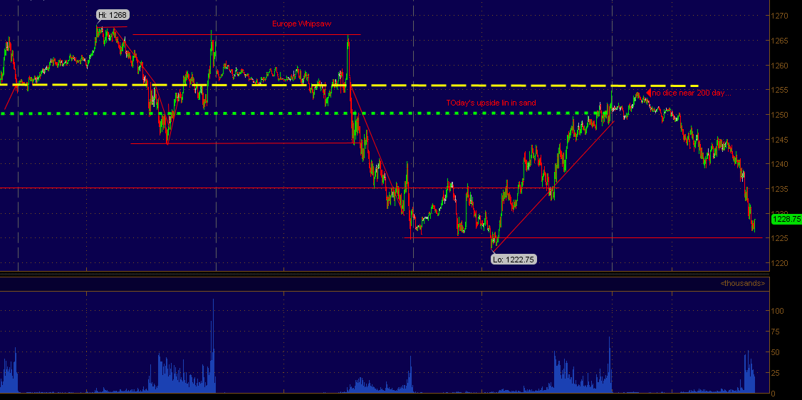 Dollar fell off of highs of 80.31 this morning around 6 am as the ES sat on 1246.. from that point on the DX slid and the ES rose as well as Gold... at one point gold was down 32 points only to retrace 50% of it's losses as the euro crawled back into bed after fallout clear under 1.30 mid day yesterday.