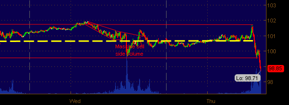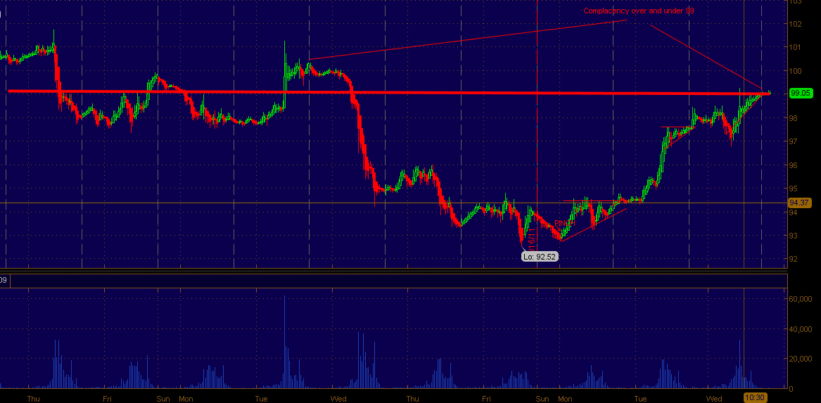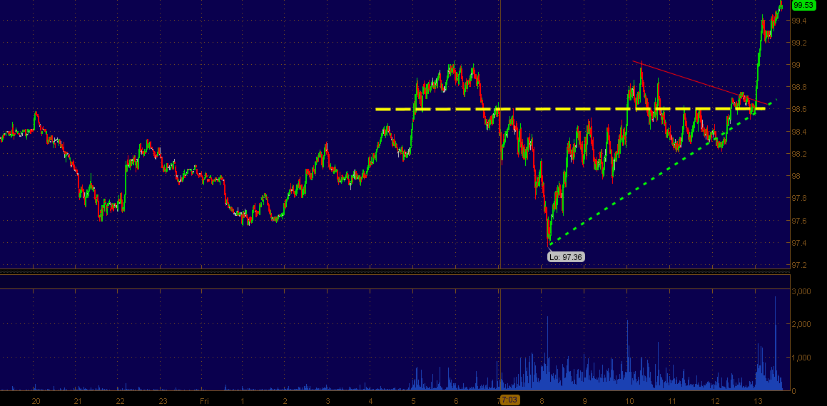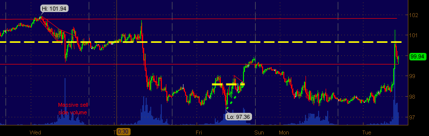 Crude.. mean reversion.. opened around 99.70 traded down below 98.50 only to close back at 99.70 . It sure looks like it wants to move higher after it took hours for 99.26 to break.. when it did it only lasted a few hours.