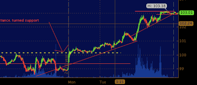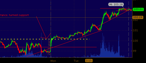 IN my eyes what caused today's move post cash open was the break over 100.15 which converted multi day resistance into support. The ball was picked up by the bulls and thrown as high as they could.