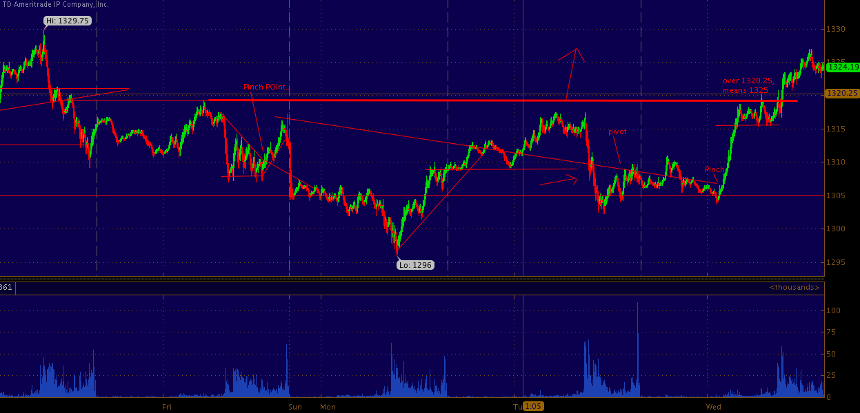 Higher prices is the theme this afternoon as the nasdaq made a new 11 year high of 2494.25 without apple or amzn's participation mind you. As for the S&P's i mentioned in my morning note over 1320 would mean 1325. 1320 traded and shortly after 1325 and up to 1327 traded. The index's have run out of steam a bit up here and may test 1320 by the close if 1323 does not hold firm.