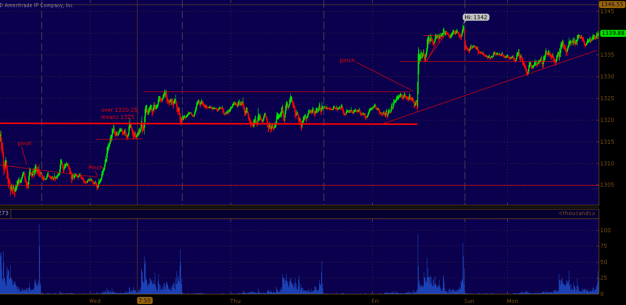 Upper resistance is 1336.5 .. over could bring a test of 1340 ... 1343 is the high for the year.