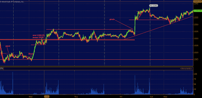 As you can see the ES melted higher very slow today with 1340.50 being the high. Bonds told us something was amiss today with TLT's curious strength over 117. Crude rather mute today post morning volatility. Gold stayed weak though off the lows...with this weeks auctions still on the horizon we could see a few more days of action like this.