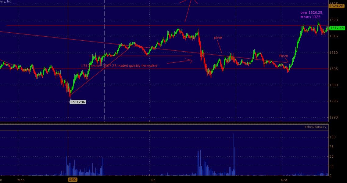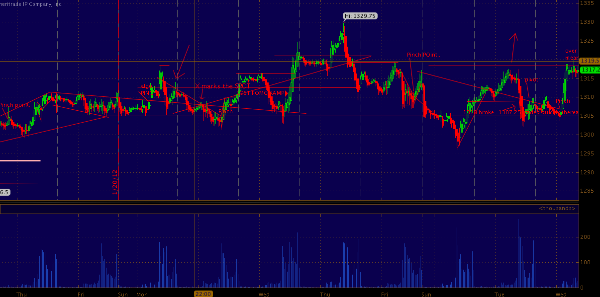 Nearly same pattern as yesterday morning. up from 1 am until about 4 am.. then sideways chop until US cash marke opens.. Over 1320.25 we could see 1325.. then possibly 1330 ... below 1315 could easily send us down to test 1310. In the chart below you can see how resilient the 1305 level has become the last week and a half. Euro strong still under 1.32 though over 1.31 ... still some short covering...