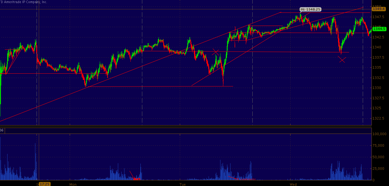 Today's selling coincidentally concluded in the area of 1338.50 which was very close ( red X ) to yesterdays immediate high off cash open. Once the ES found its legs again after failing 1337.25 yesterday it rallied all the way into new highs as the day concluded.