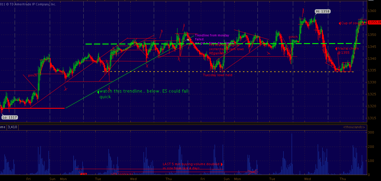 The 1212 high for the ES is 1358. If we can trade over 1357 and hold that could convert into 1358's trading and a new set of buy stops could be lifted into 1360's. The downside ledge is a steep one because of how steep the rally was today.. we rallied through 1345's 1350's and 1355s.. thus 1355's is very immediate support with 1350 support giving some solid breathing room.
