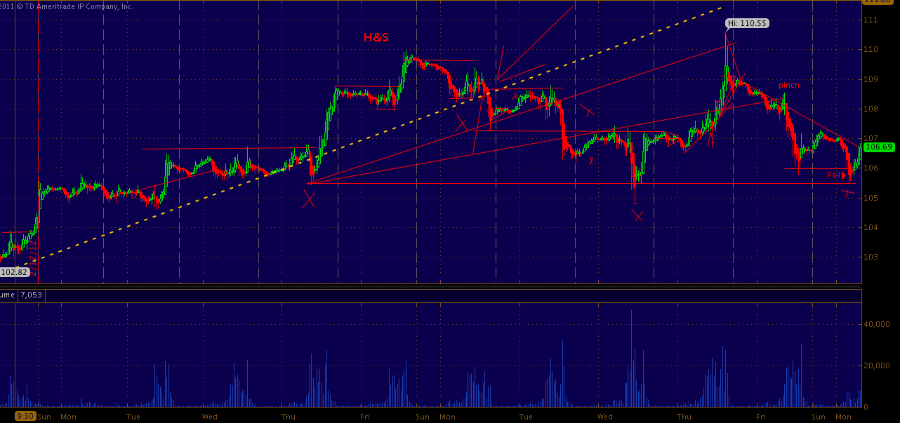 The 107 level is considerable resistance, and was last night ledge which ledge the price down to 105.50. buyers bought the price back up to the downtrend like you can see below.
