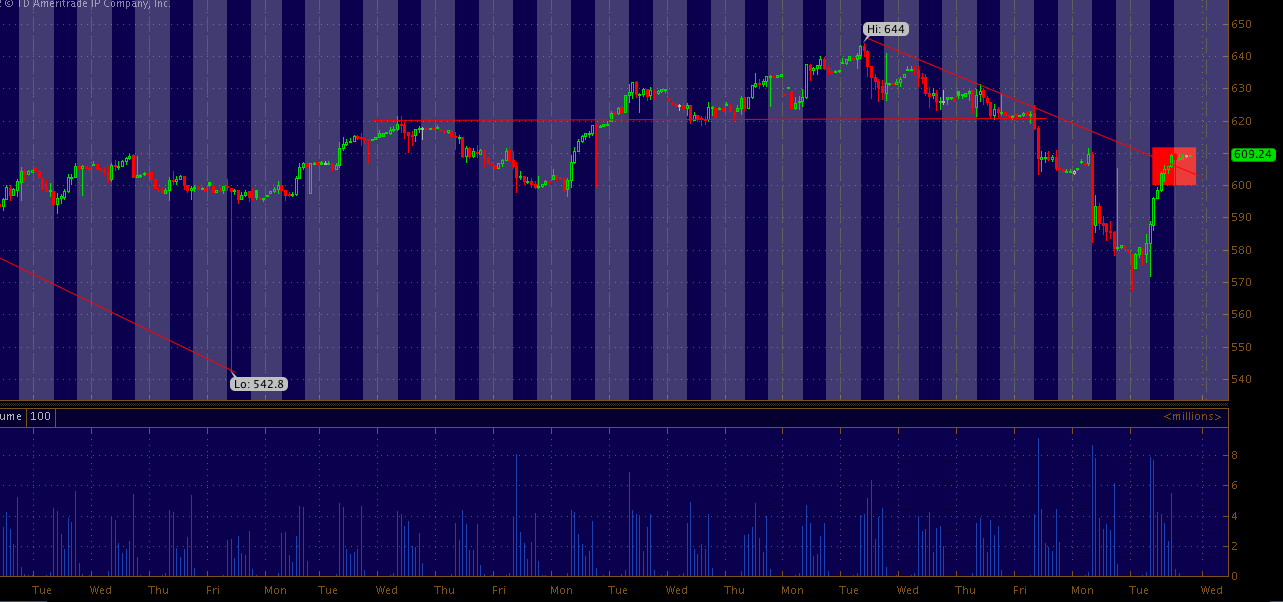 It is indeed quiet interesting how apple rallied very un-randomly into the 600 pivot level in a single day as short covering beget short covering. The market that sells together squeezes together. The game is now will 600 hold? or will 610 be taken out first? My guess is if we get any type of positive spin tomorrow 615 will be tested on its way to 620.