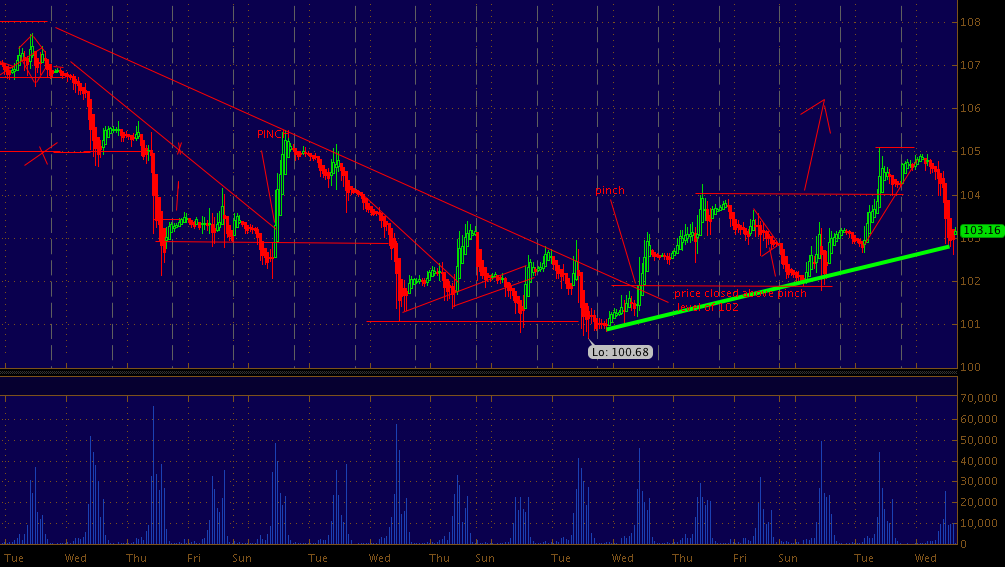 Inventories actually mattered today. woosh. last quarter of the channel mentioned yesterday held as support around 103. green line is interesting.