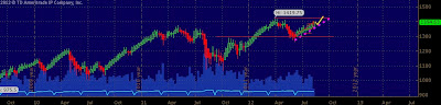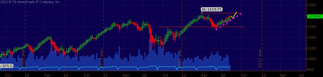 two charts.. you can take from them what you want... my view is the yellow line.. clearly 1420 is a big upside level of attraction.. as is 1300, especially if the dotted purple line fails before 1420 is taken out..