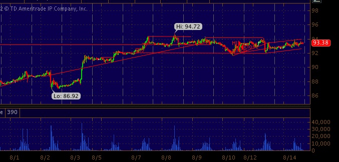 Either we break out over 94 on a draw or we fall to 92.50 .. if that fails 92 is a big support level from last week.