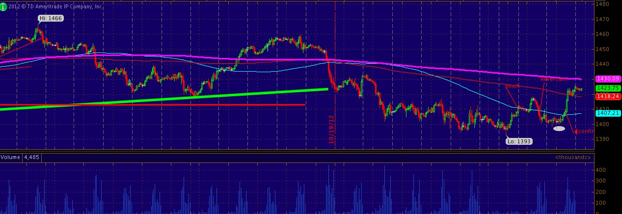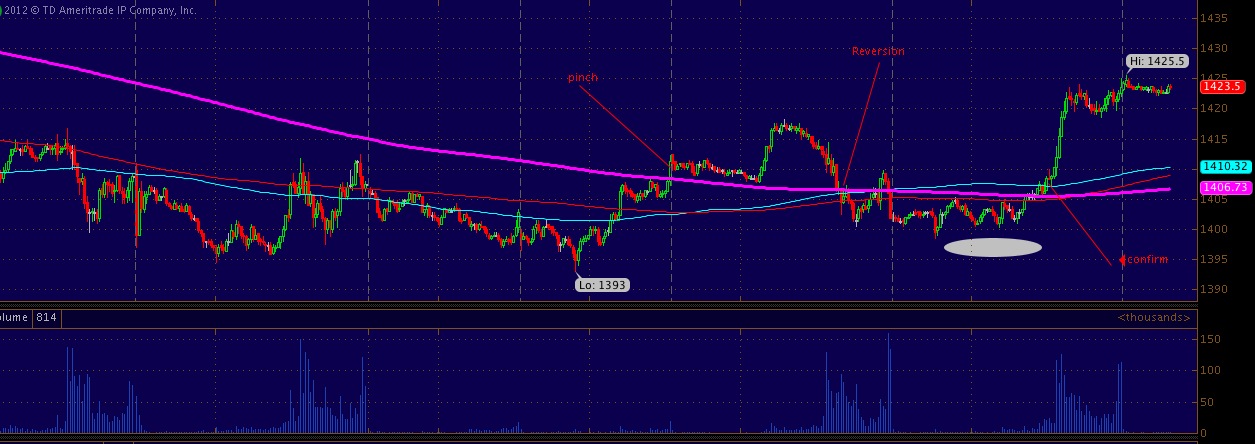 Referring back to yesterday's morning S and P update we spoke about the possibility of a pinch over 1420 into 1424