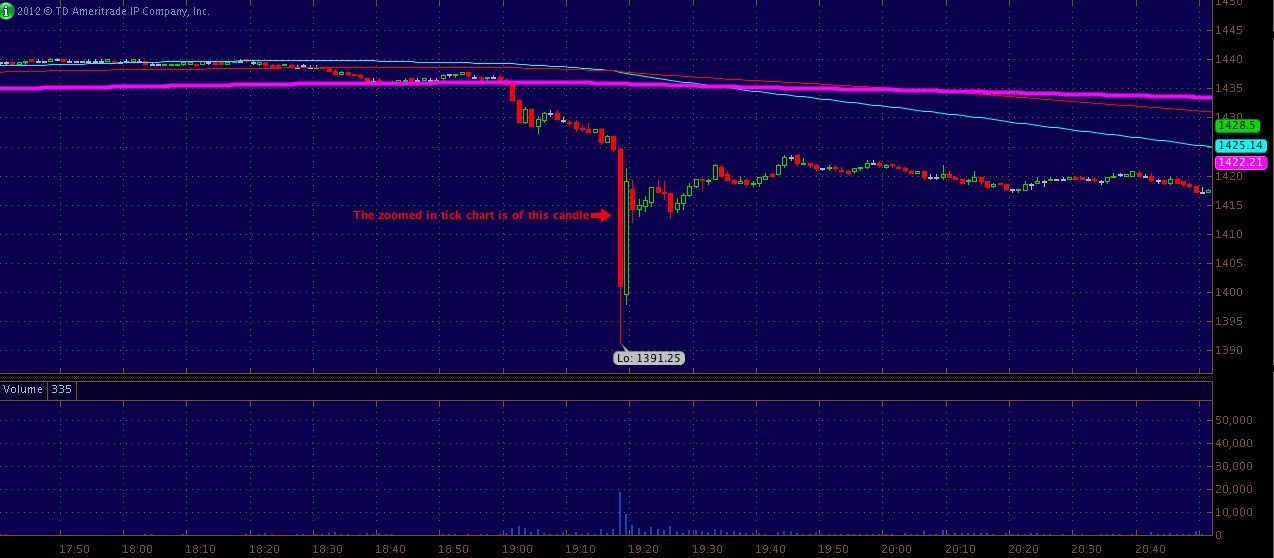You can see by the purple arrows in the above chart the selling started up 1422.25 then proceeded to tumble into 1391.25 before the market found a bottom and recovered almost as fast. Much like the FLASH crash on May 6, 2010 just MUCH MUCH faster.