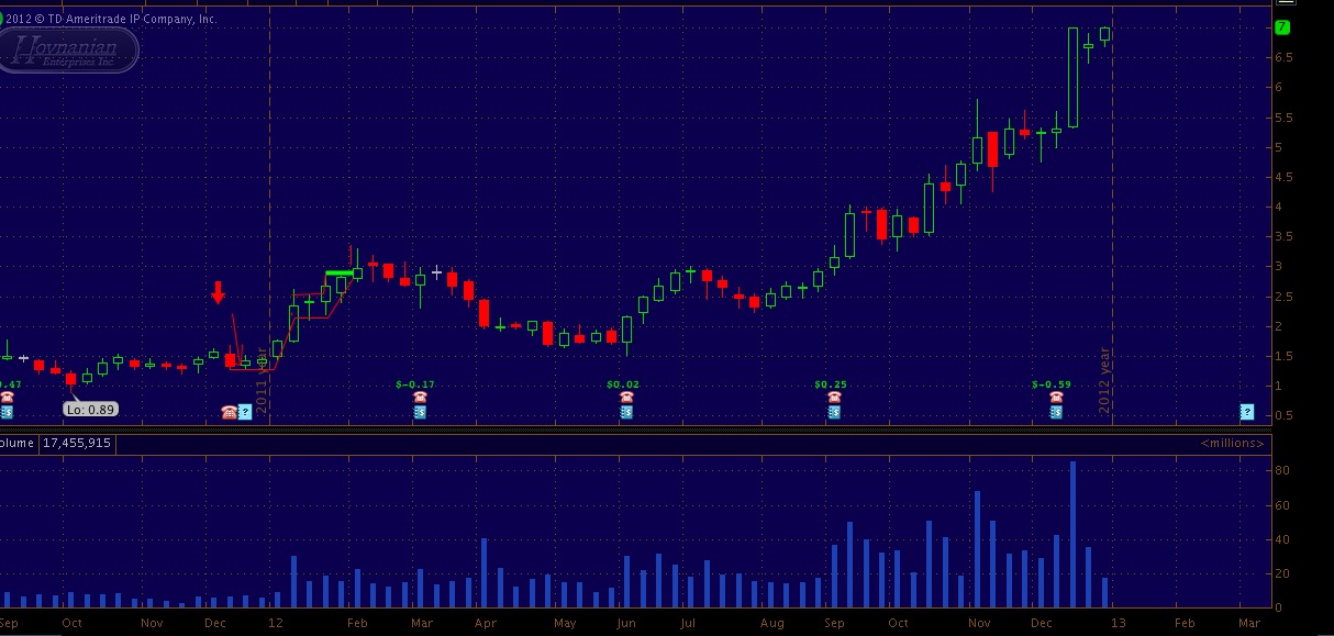 The chart below is that of $HOV.... A stock which we mentioned here in later 2011 as a performer for 2012, it turned into a 7 bagger. as it closed @ 7 dollars today. $XHB also has done well. Remember the trade the media hates to love is usually the trade you should take the opposite of.