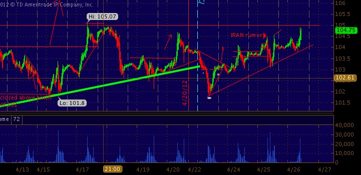 30 min CL .. notice the bullish move off the 102 level "V pinch" |