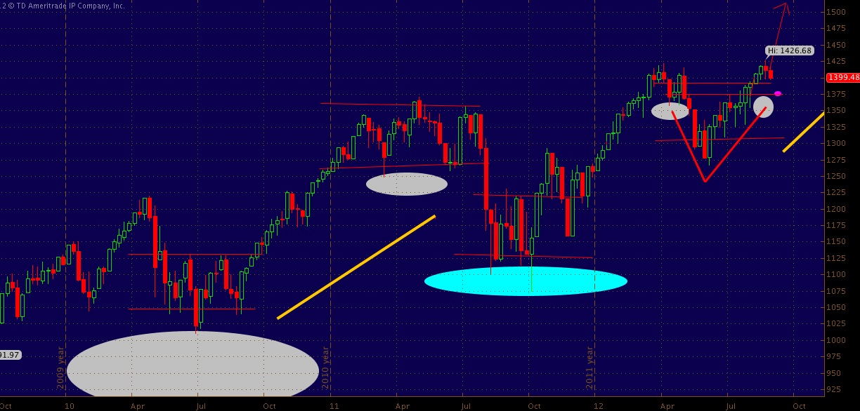 | weekly SPX (notice inverse H&S pattern) SPX 1390 (purple oval) is initial support if we give way tomorrow on the open. below that we have air gaps about ever 10 points down to 1363.63 |