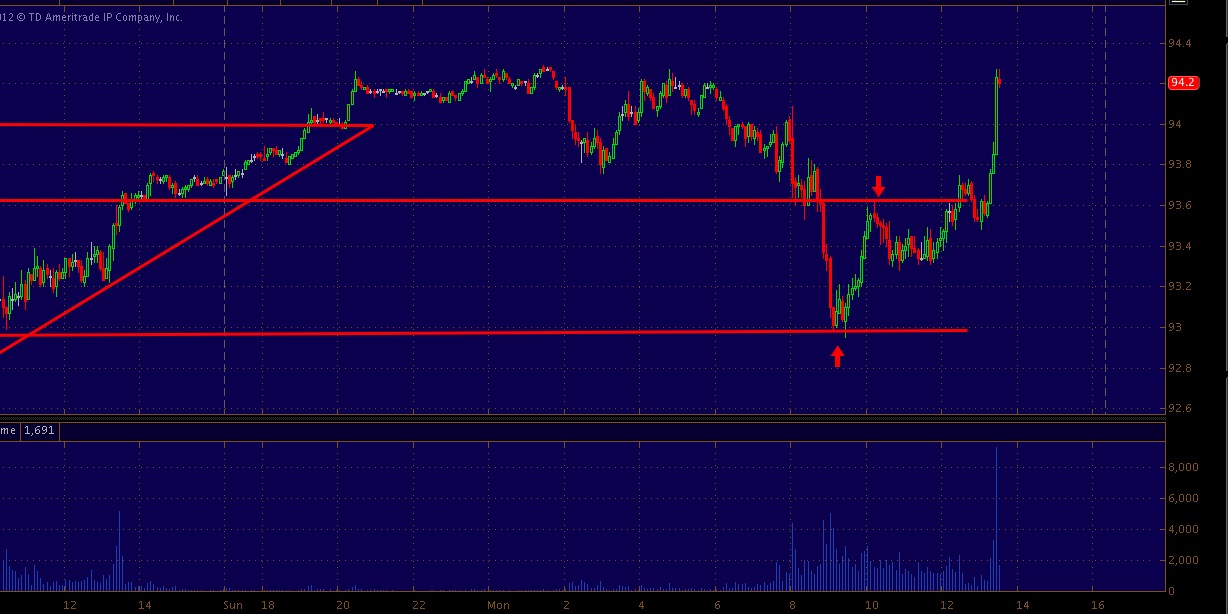 Updated 5 minute showing the squeeze into the close below - If you played the 93 pivot you were rewarded