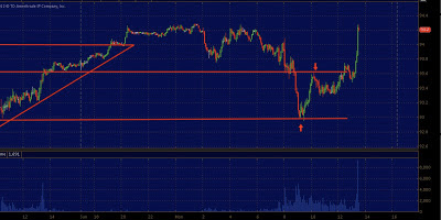 Notice what happend today, 93 traded then a few stops a few pennies below 93 were triggered then a 60c bounce into Friday afternoon right shoulder of the inverse H&S. The arrows show the pivot.