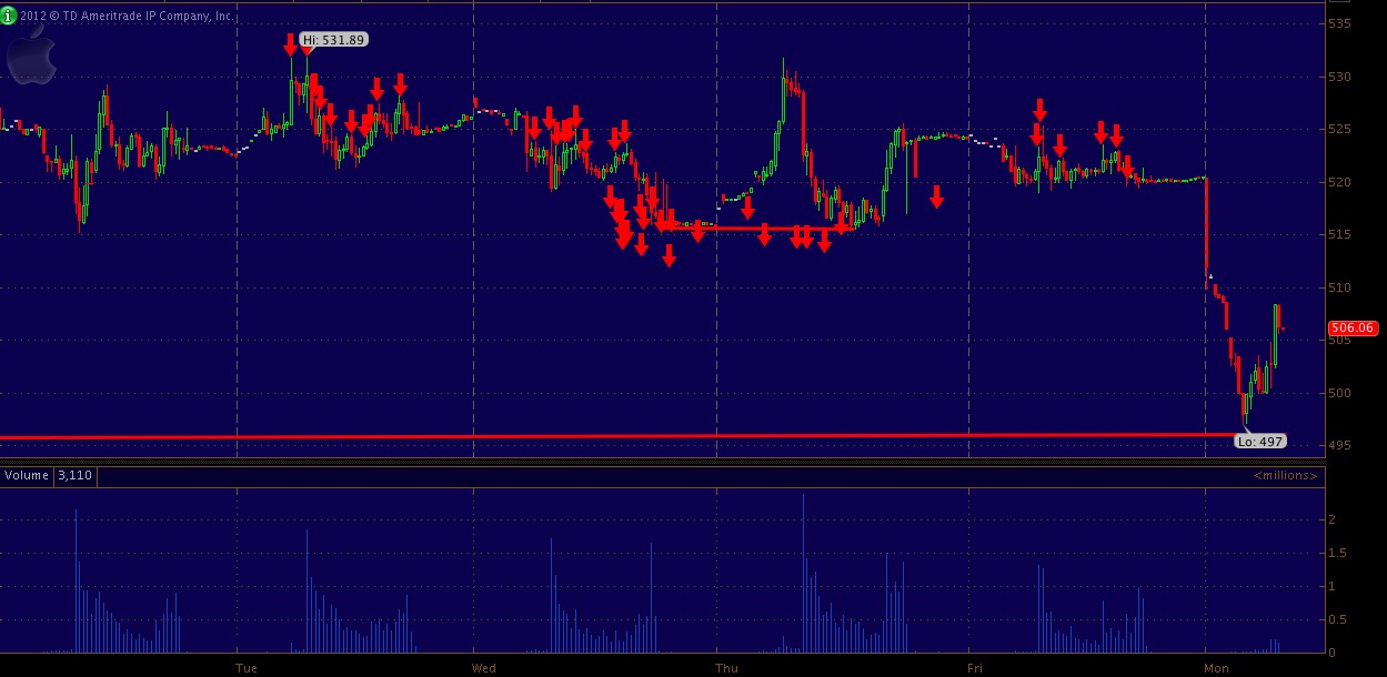| 15 min AAPL - notice the arrows up at 531 and the spikey price action... looks like we now know why the stock was being offered ..... |