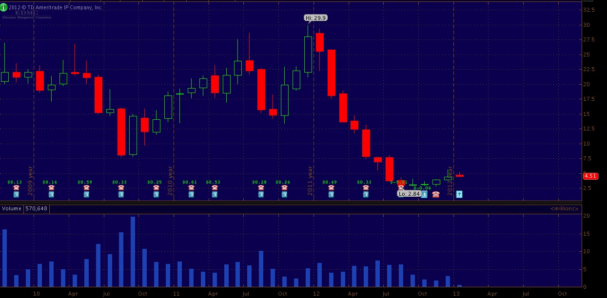 $EDMC was listed in october of 2009 trading up to 26.98 before collapsing to 4.51 today. The 2012 low was 2.84.
