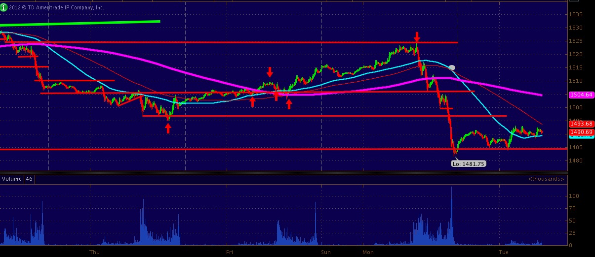 There is not much change in the ES from our Monday evening post as the 1485 level remains support and 1492 resistance. Currently the S&P 500 is 1491.0, 4.25 points or 0.29% following disappointing Italian election results.