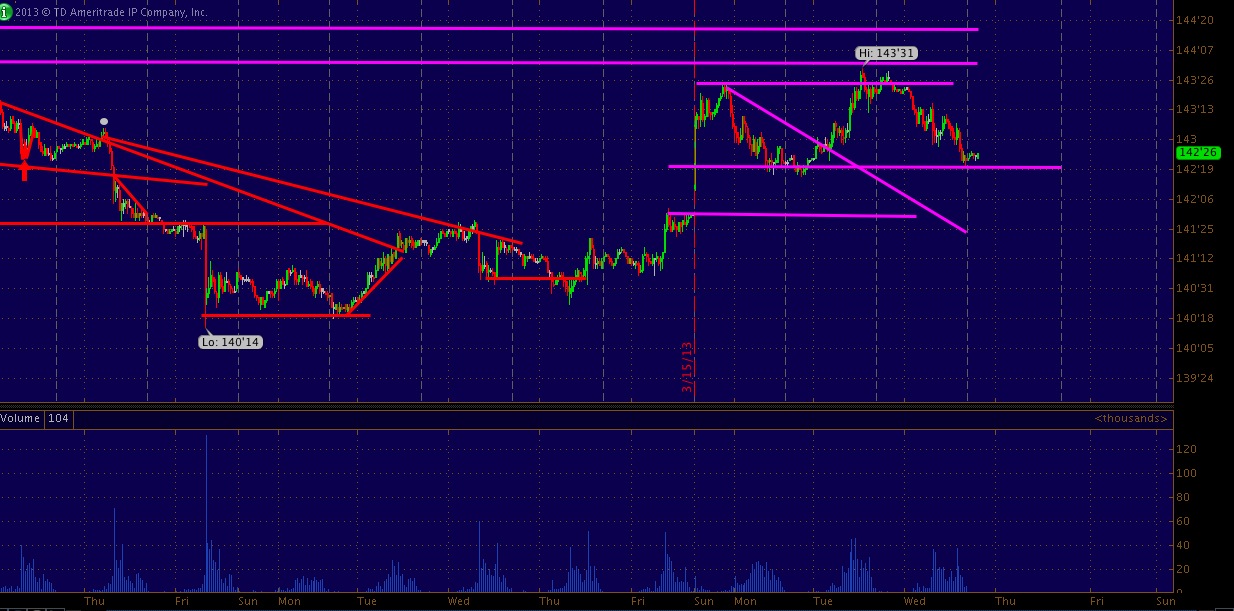 *note in the chart below the sharp sell off following the high of the day print @ 14:45hrs. I find trend reversals curious in regards to (algo influence) when they occur on a round number on the time line @ a round number on the time axis.. A example of this is as the 94.47 high in CL yesterday precisely @ 7:00 am CT before the sharp 2 dollar drop.