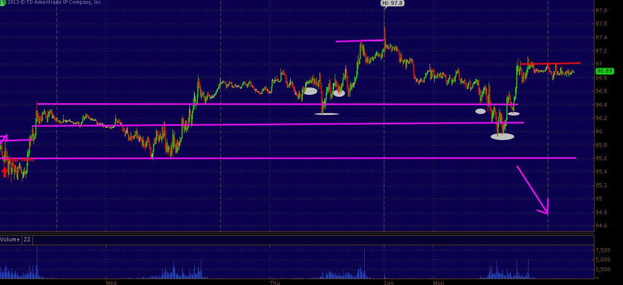 Crude bulls should be excited to see the DX falling a bit as Sunday's gap into 97.80 was faded all the way into 96 before buyers sling-shotted the price back up into 97 resistance where it currently sits as of this writing.