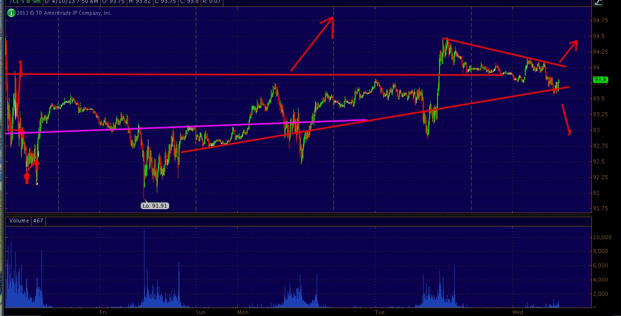 Japanese Yen futures are lower to 10.064 down 0.13% after though are over yesterday's low; which makes correlative sense because crude is still under yesterday's high of 94.48. If the Yen can make a low a supportive big bid will likely move into CL, especially if 6E picks up some lost ground.