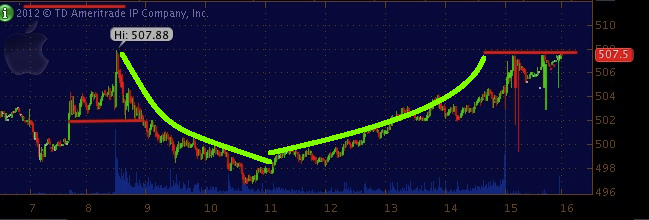 Apple shares are back at the 500 level on the nose as its shares fell from 503.75 in early trading. Due to the magical close @ 500 on Friday's January opex you can expect a break of the 500 level to cause selling into 498, over 504 means 510 based on prior trends.