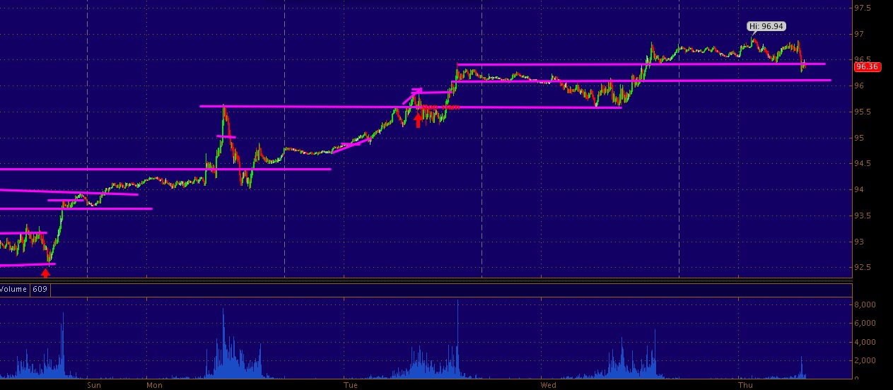 On the flip said the 96.60 level if converted back to suport will provide the launchpad into 97, especially if the DX falls off and 6E continues to retrace Wednesday's drop.