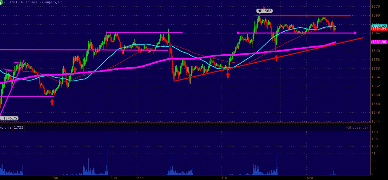 Taking back Wednesday was there theme as it has not stopped raining in Chicago and bonds have stopped rising for two days. The bonds again were the underlying force keeping a consistant heavy ES offer due to the arbitragers, though what is new?